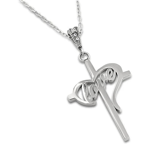 Cross with Heart LOVE Necklace, Stainless Steel Chain